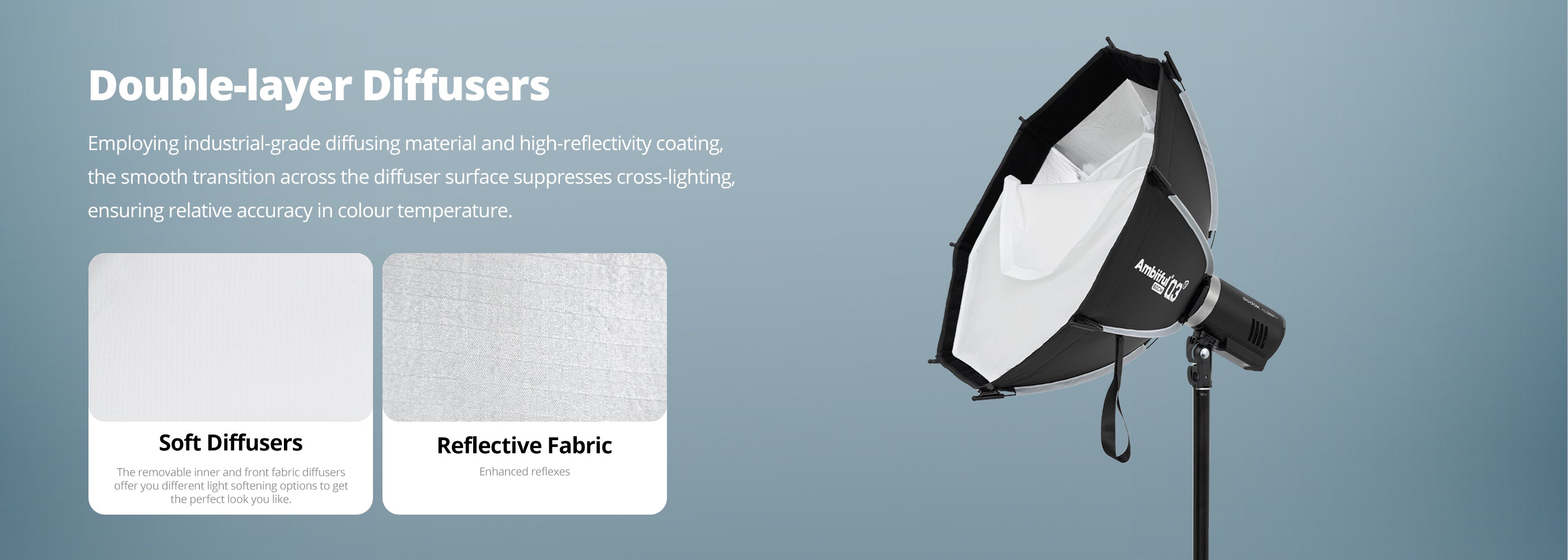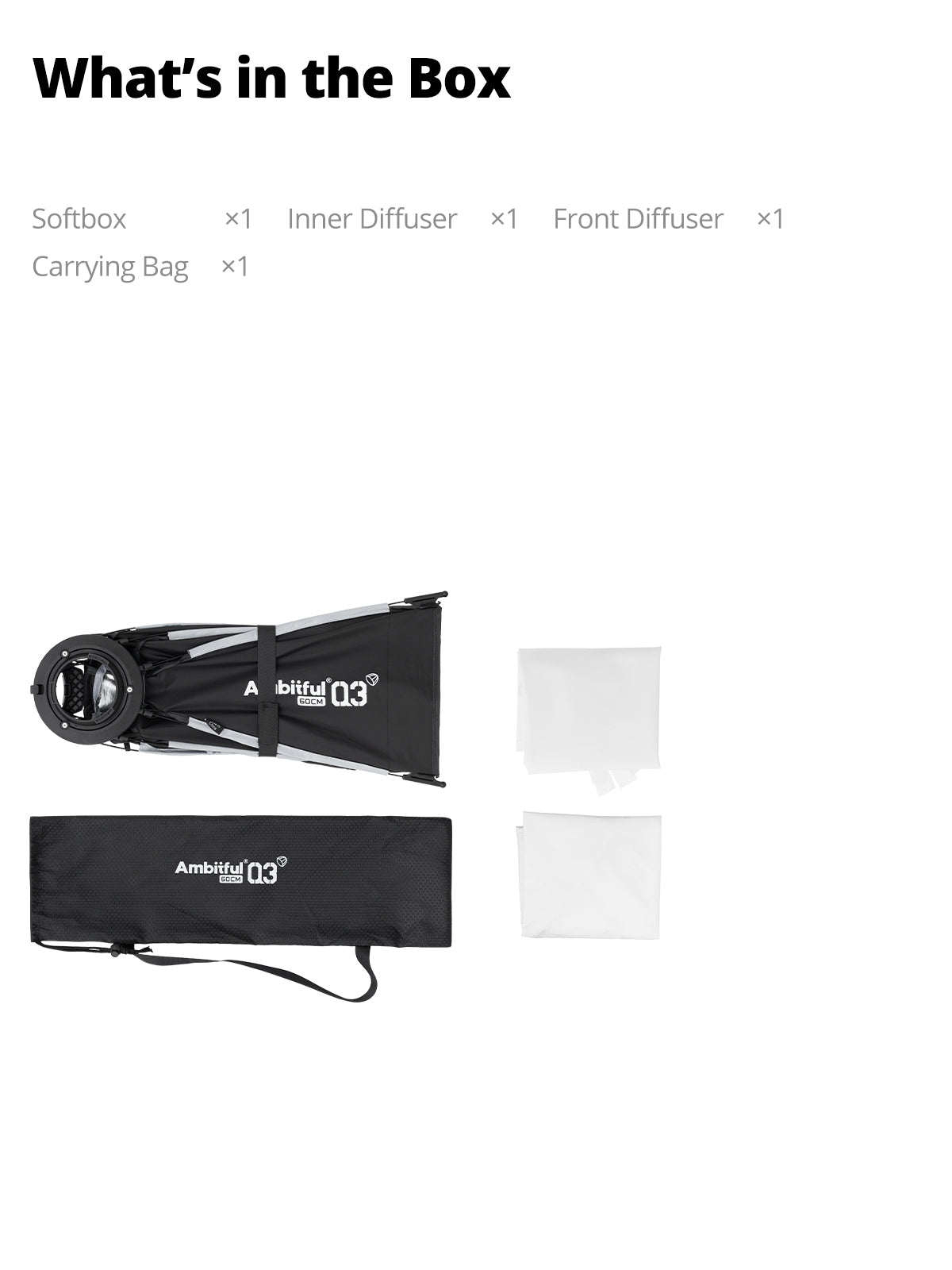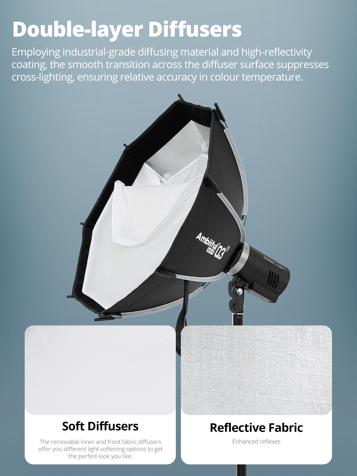 - Dual-Layer Diffusion: Includes a removable inner softbox and front diffuser fabric for uniform, soft, and color-accurate light.