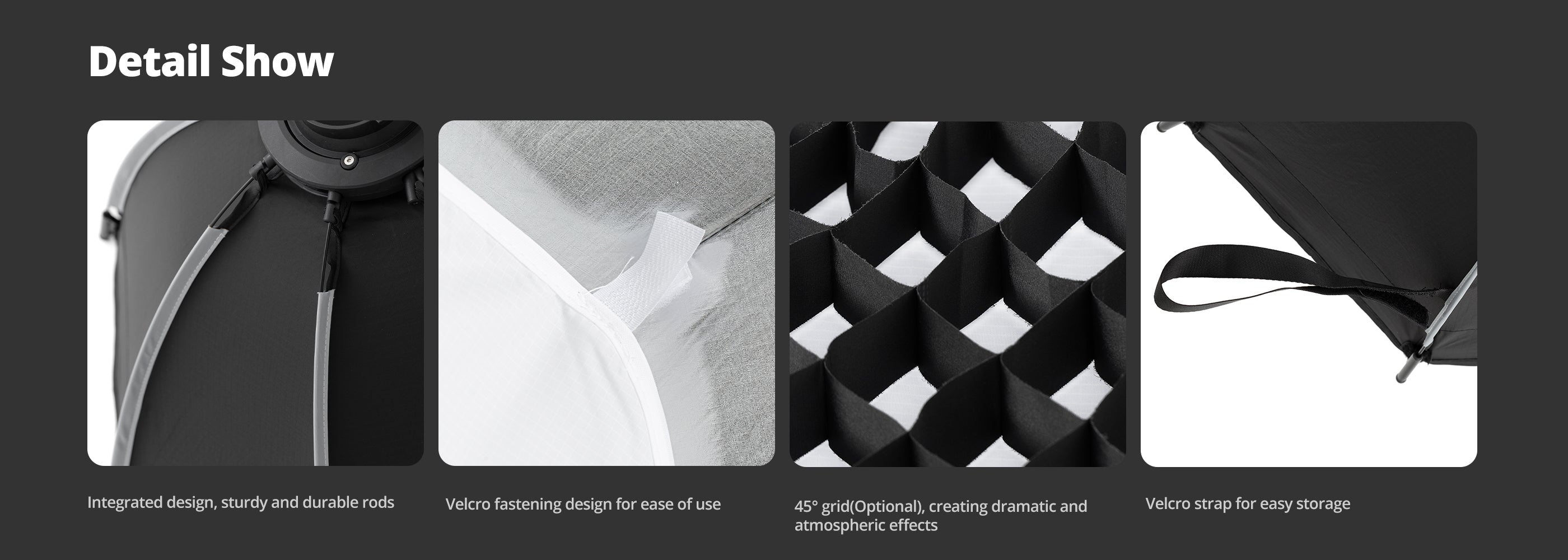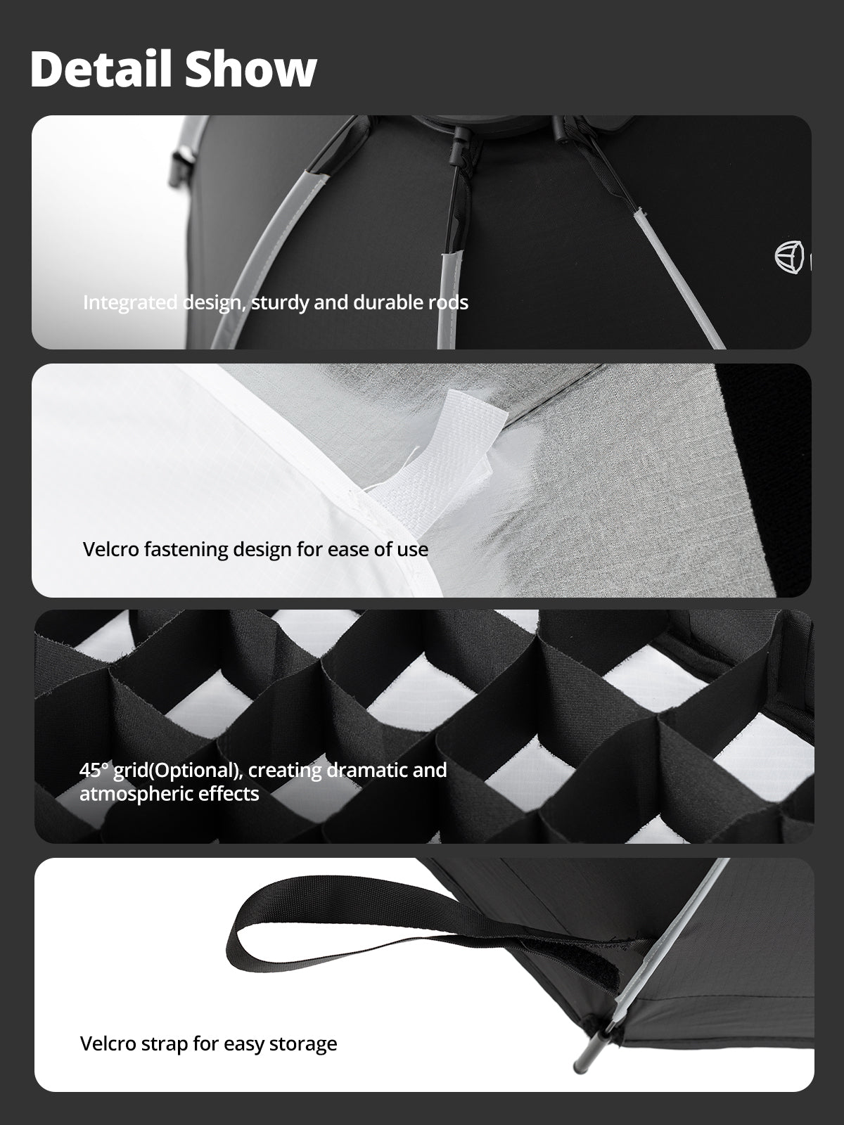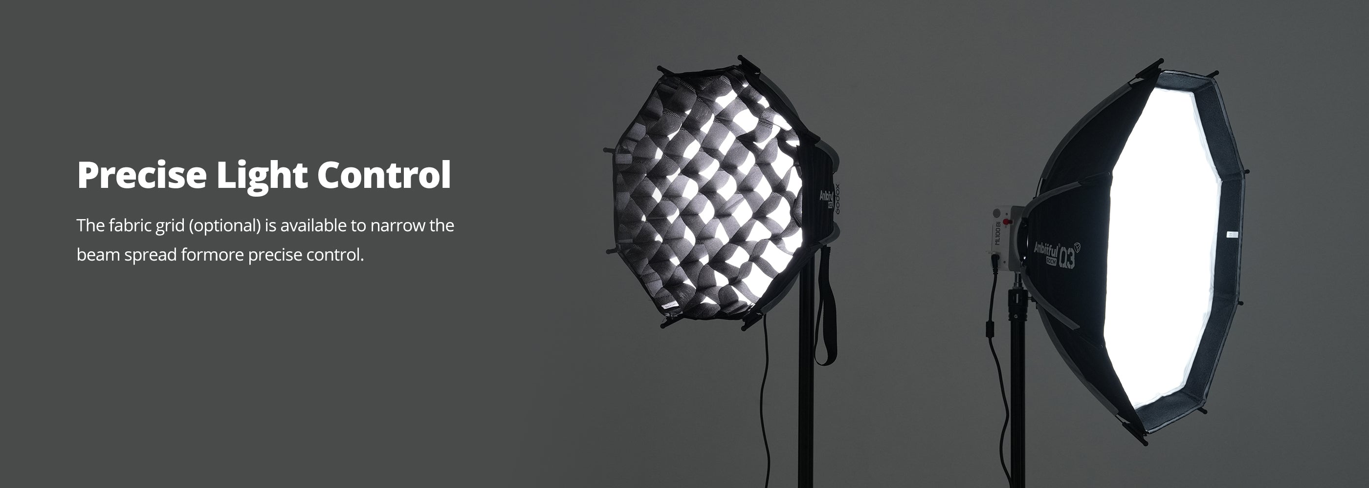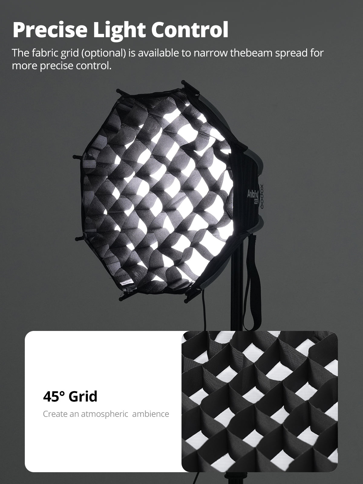 - Versatile Light Control: Offers multiple setups—soft wrap-around light, ultra-soft diffusion, or focused beam with an optional 45° honeycomb grid.