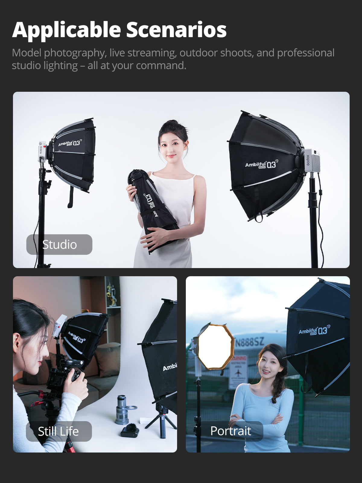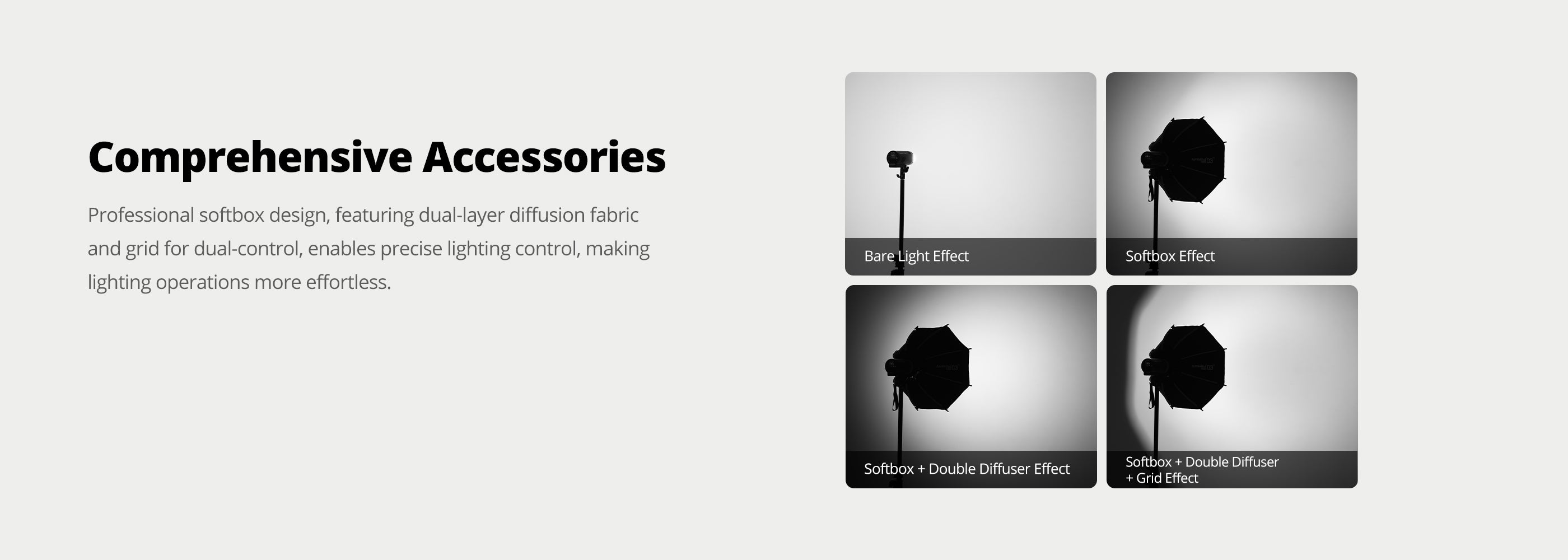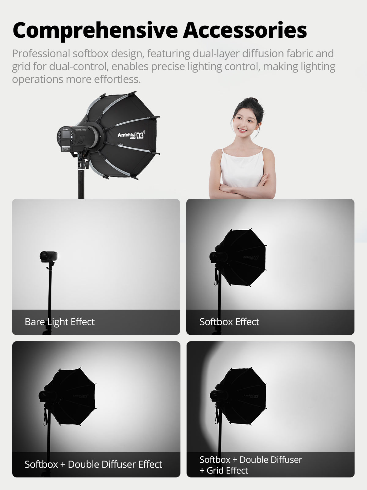 - Versatile Light Control: Offers multiple setups—soft wrap-around light, ultra-soft diffusion, or focused beam with an optional 45° honeycomb grid.