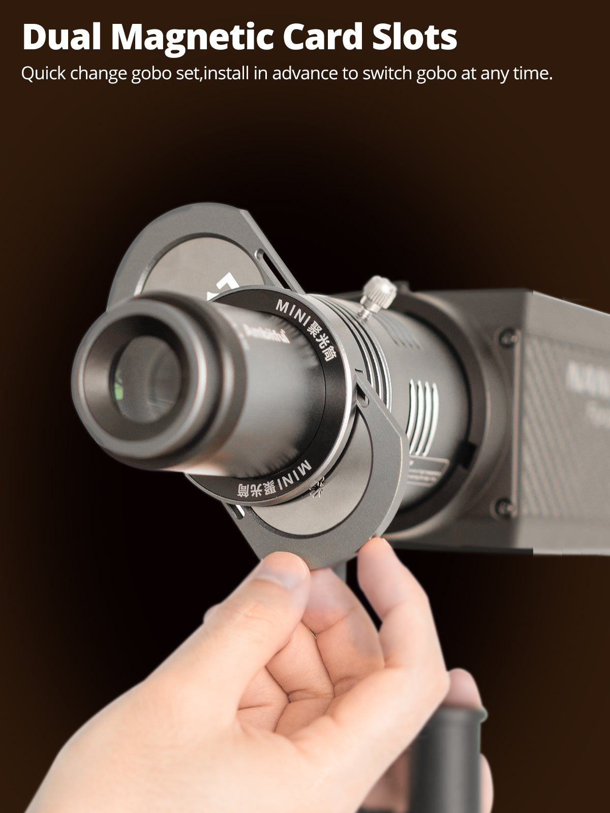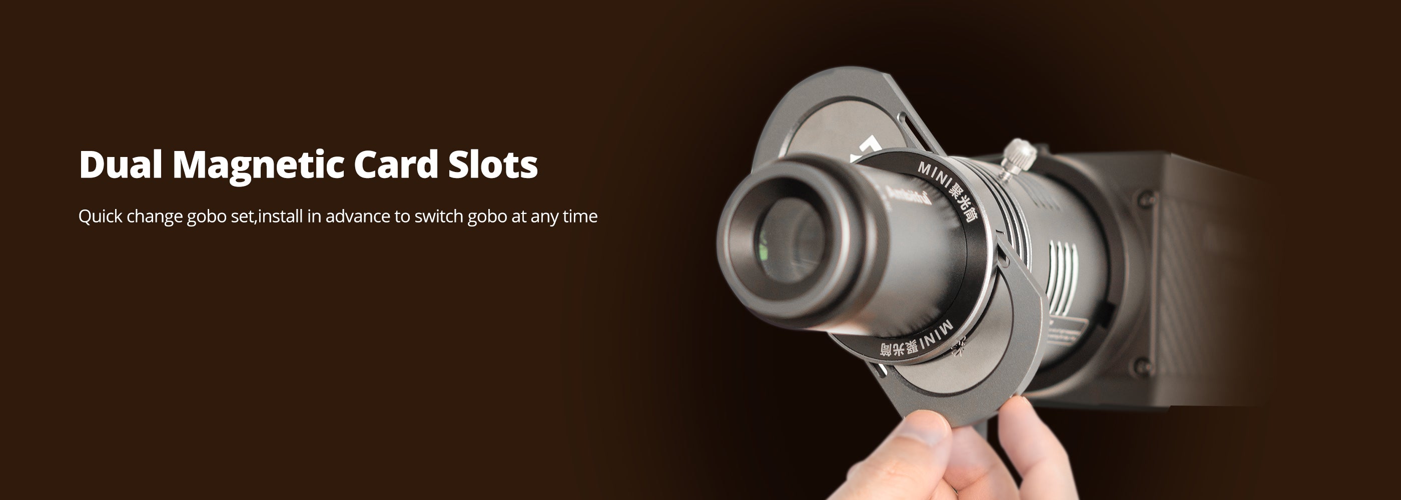 - Magnetic Dual GOBO Frame: Enables quick switching between two patterns with tool-free installation.