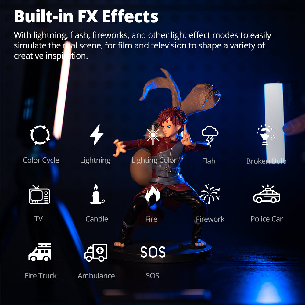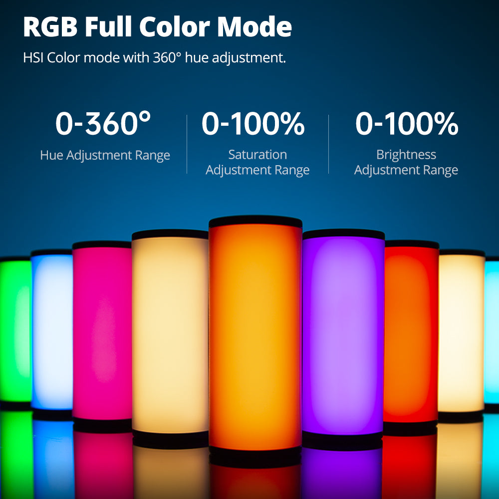 【Adjustable Lighting Modes】Featuring adjustable hue (0°–360°), brightness (0%–100%), and color temperature (2500K–9000K), along with 13 built-in light effects. The built-in LCD display provides real-time parameter monitoring.